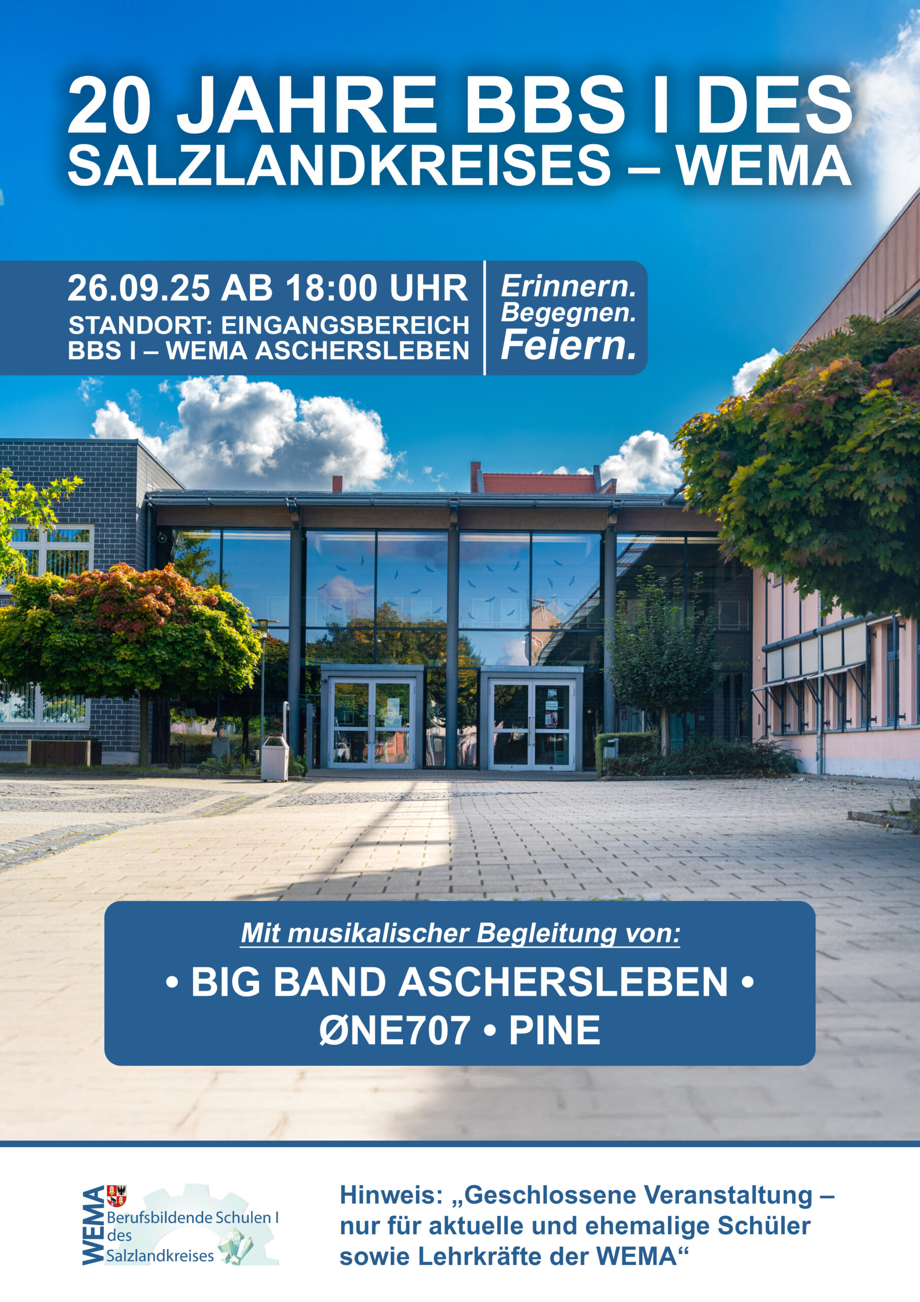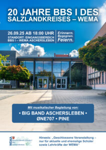 Nutzen Sie die Gelegenheit, alte Freunde wiederzusehen und sich in den bekannten Räumlichkeiten der BbS WEMA in Aschersleben zu treffen. Wir freuen uns auf ein Wiedersehen mit Ihnen.