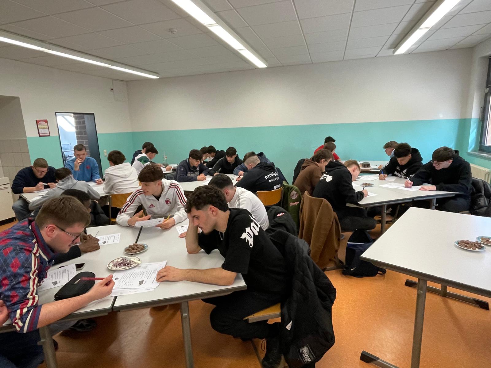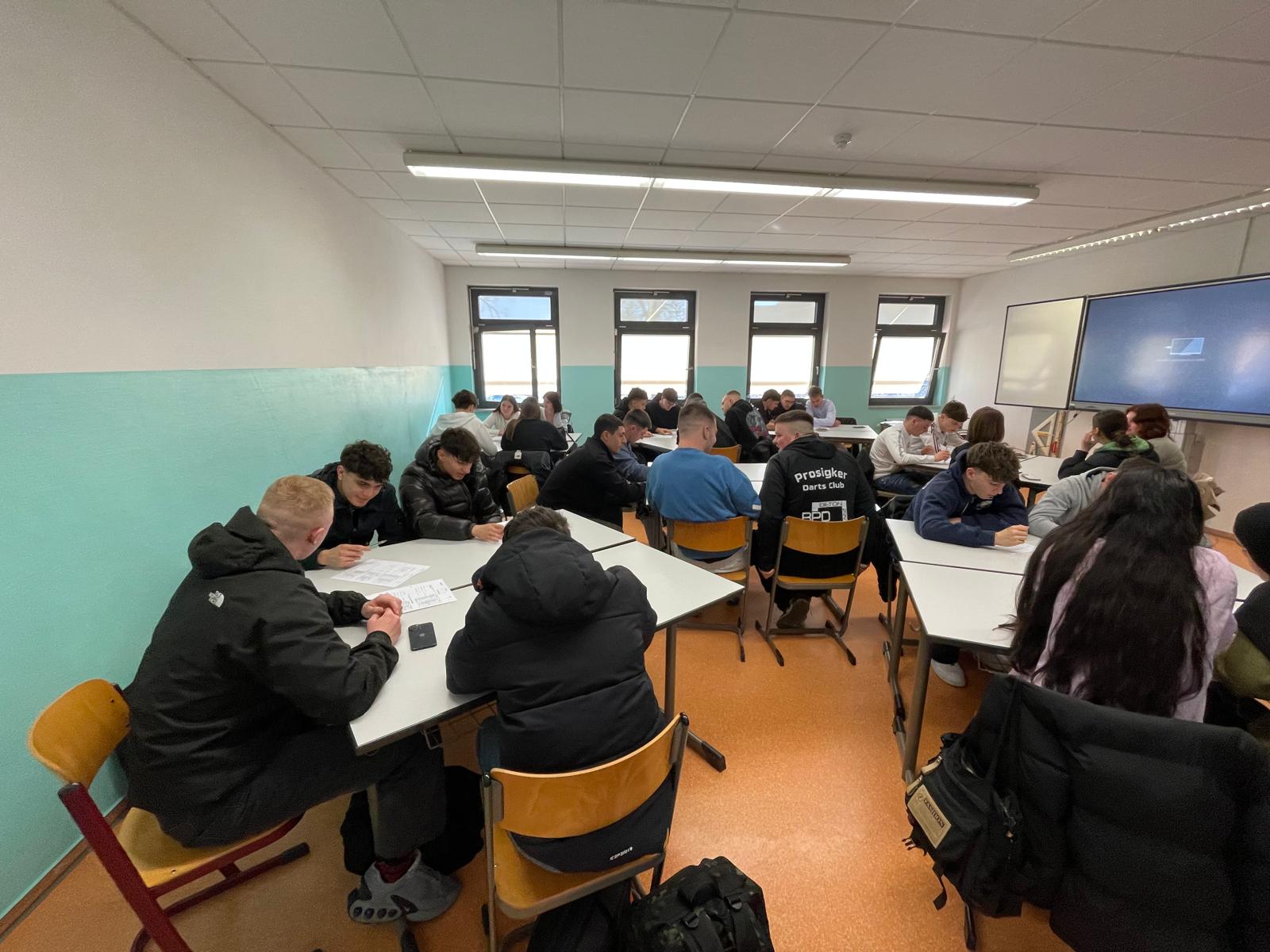 Danach gab es eine Schulführung: Klassenräume, Werkstätten und natürlich die WEMA-Sporthalle. Dass diese später noch wichtig wird, ahnte zu dem Zeitpunkt noch keiner. Logik- und Rechenwettbewerb Im Anschluss wurde es ernst – zumindest ein bisschen. Die FKL25 veranstaltete einen Logik- und Rechenwettbewerb in gemischten Teams. Die wichtigste Regel: Keine Taschenrechner! Was folgte: Diskussionen, Kopfrechnen, wildes Gestikulieren – und jede Menge Gelächter.